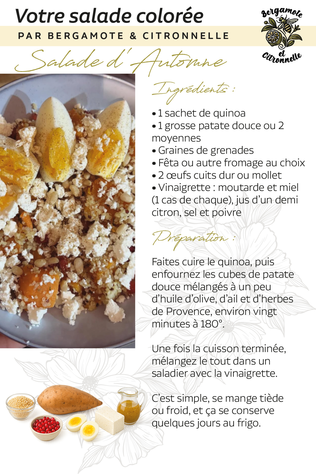 Question facilité et tranquillité d’esprit ce qu’on adore en été ce sont les salades ! Variées colorées prêtes en un tour de main, elles nous régalent ! L’automne (je dirais presque l’hiver 🥶) nous donne envie de réconfort, hé bien voici une salade d’automne qui n’a rien à envier à celles d’été !
